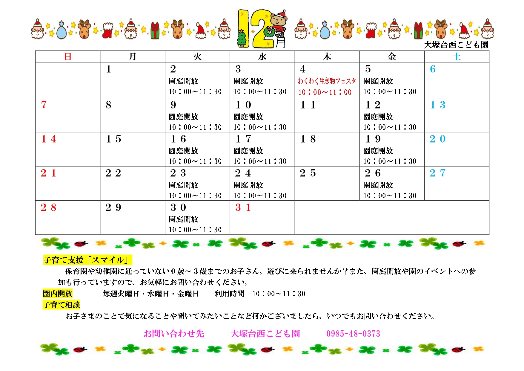 12月 子育て支援「スマイル」 2025.11.26 12月のスケジュールです。 4日のわくわく生き物フェスタでは、大淀川学習館からカメやメダカ、カエルなど様々な生き物がやってきます。 ぜひご参加ください。 Tweet Share 防災訓練 前の記事 お誕生会(11月) 次の記事